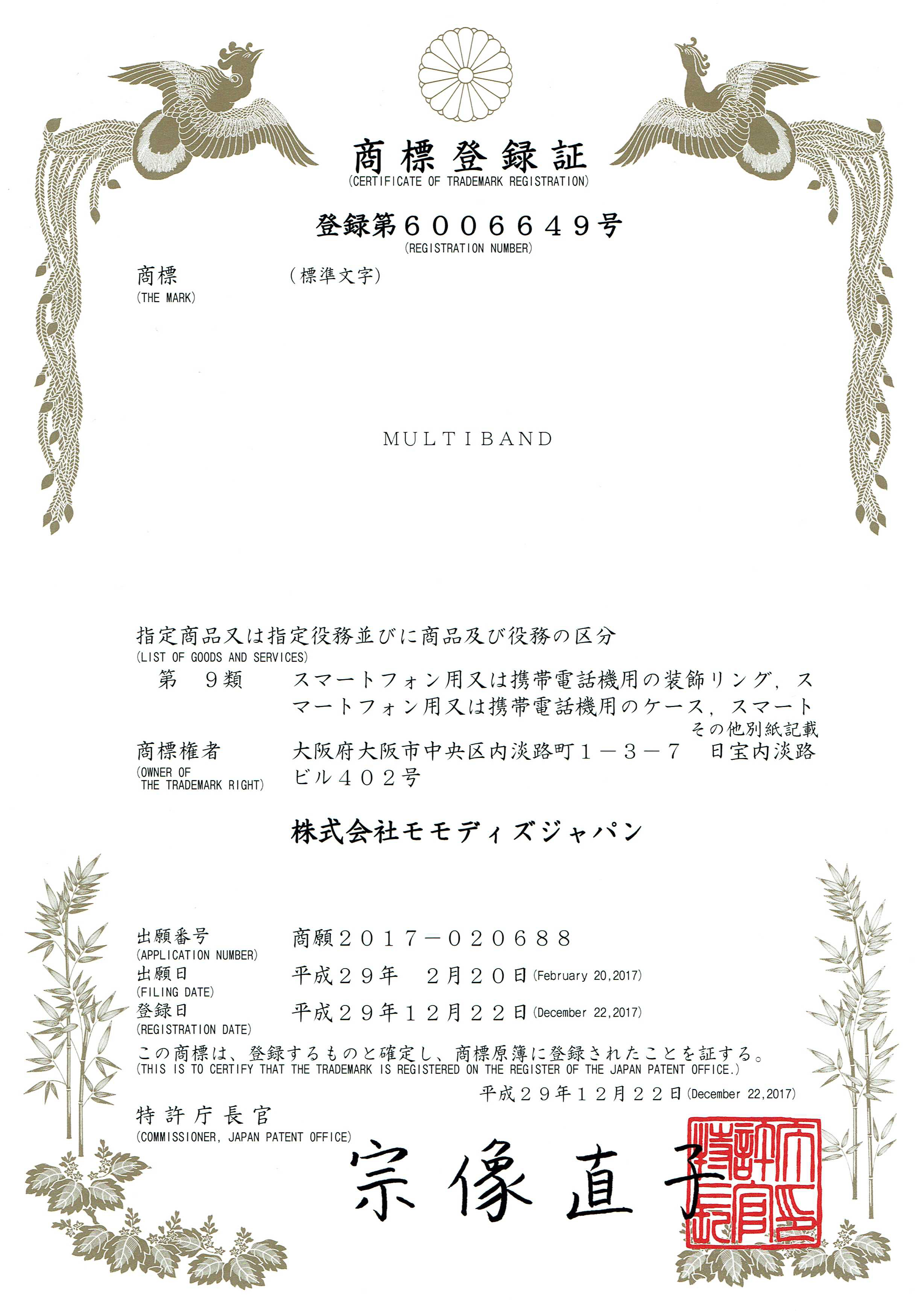保有商標権のお知らせ 「MULTIBAND」の商標が追加で獲得されました。 下記の商標は株式会社モモディズジャパンが保有 ...